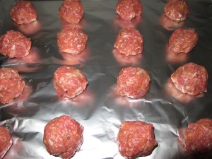 Mix it all together by hand.  I have tried to do it with a spoon because I am not a fan of mixing meat by hand, but I always end up tossing the spoon aside because it really doesn’t work.  Roll into balls about one and a half inches wide.  Bake at 350 degrees for about 20 minutes.  I suggest lining your baking pan with tinfoil.  The meatballs leak out a bunch of fat and it is not fun to clean off your pan.