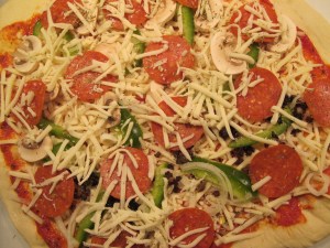 Top the crust with your toppings of choice.  Bake for 8-10 minutes at 500 degrees.  It is best if you can do this on a pizza stone.  This recipe is originally from the America’s Test Kitchen.  I have made it so many times I just do it from memory so it is not exactly the same.  You can also use this crust for a pretty good stromboli.